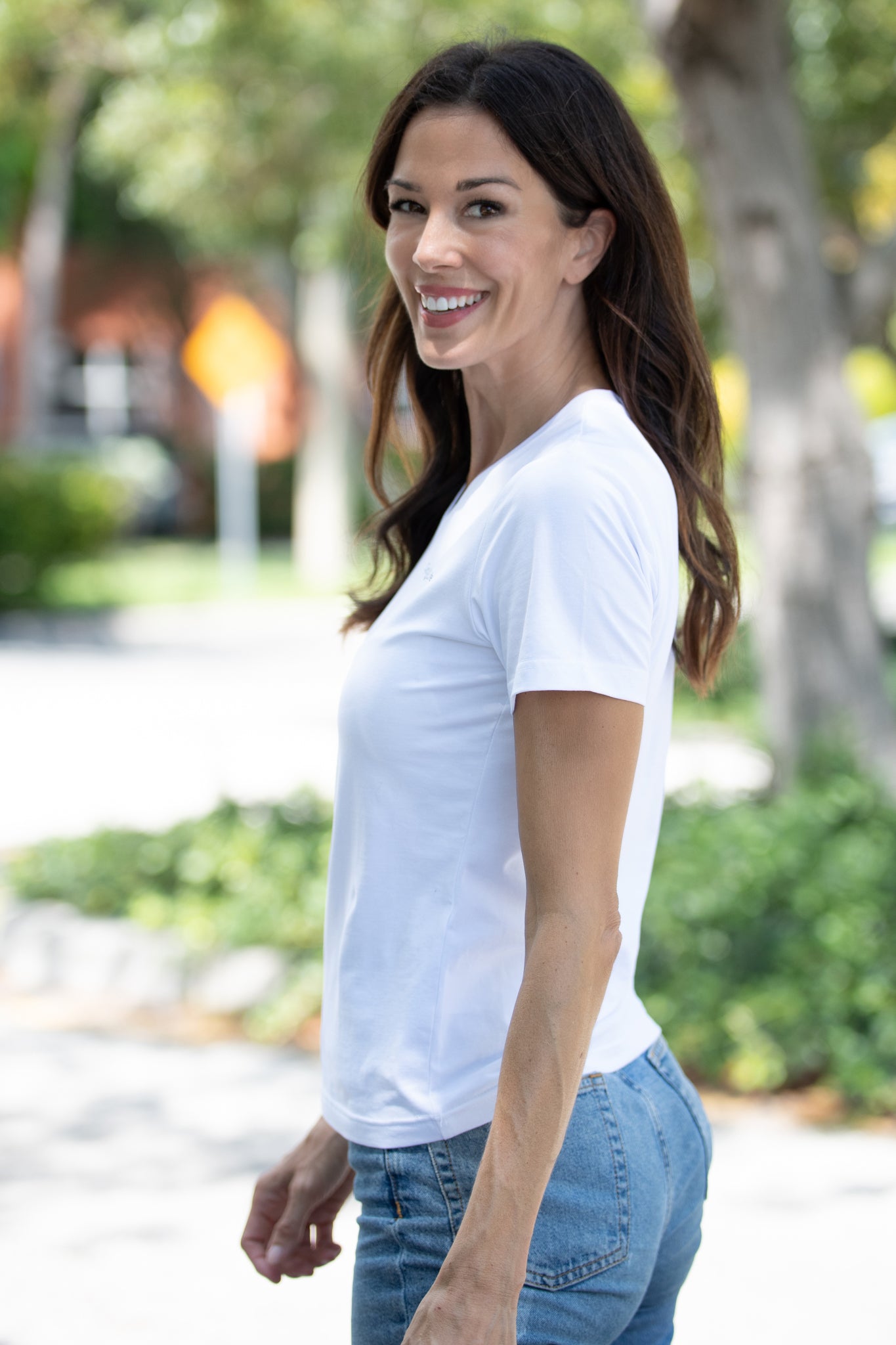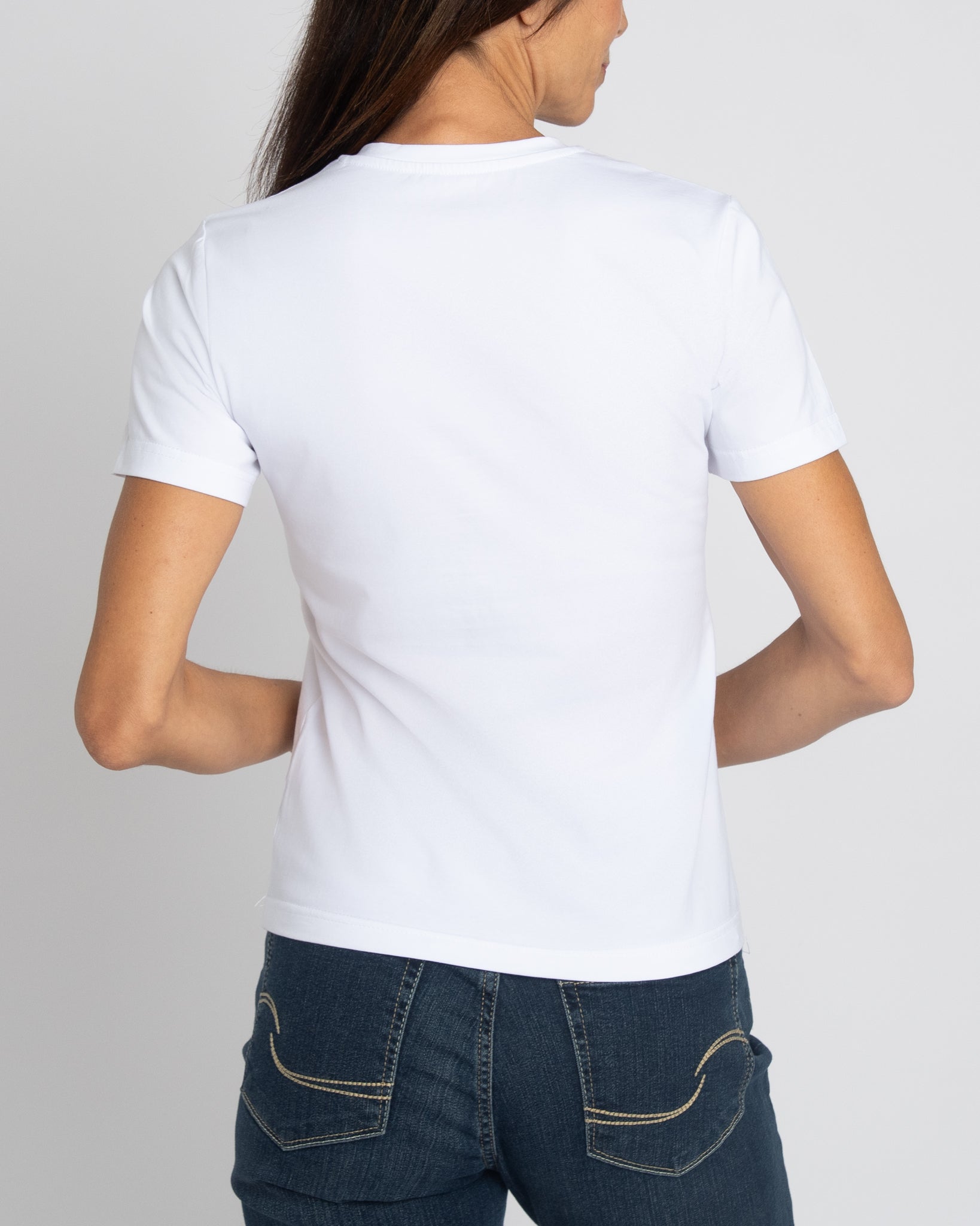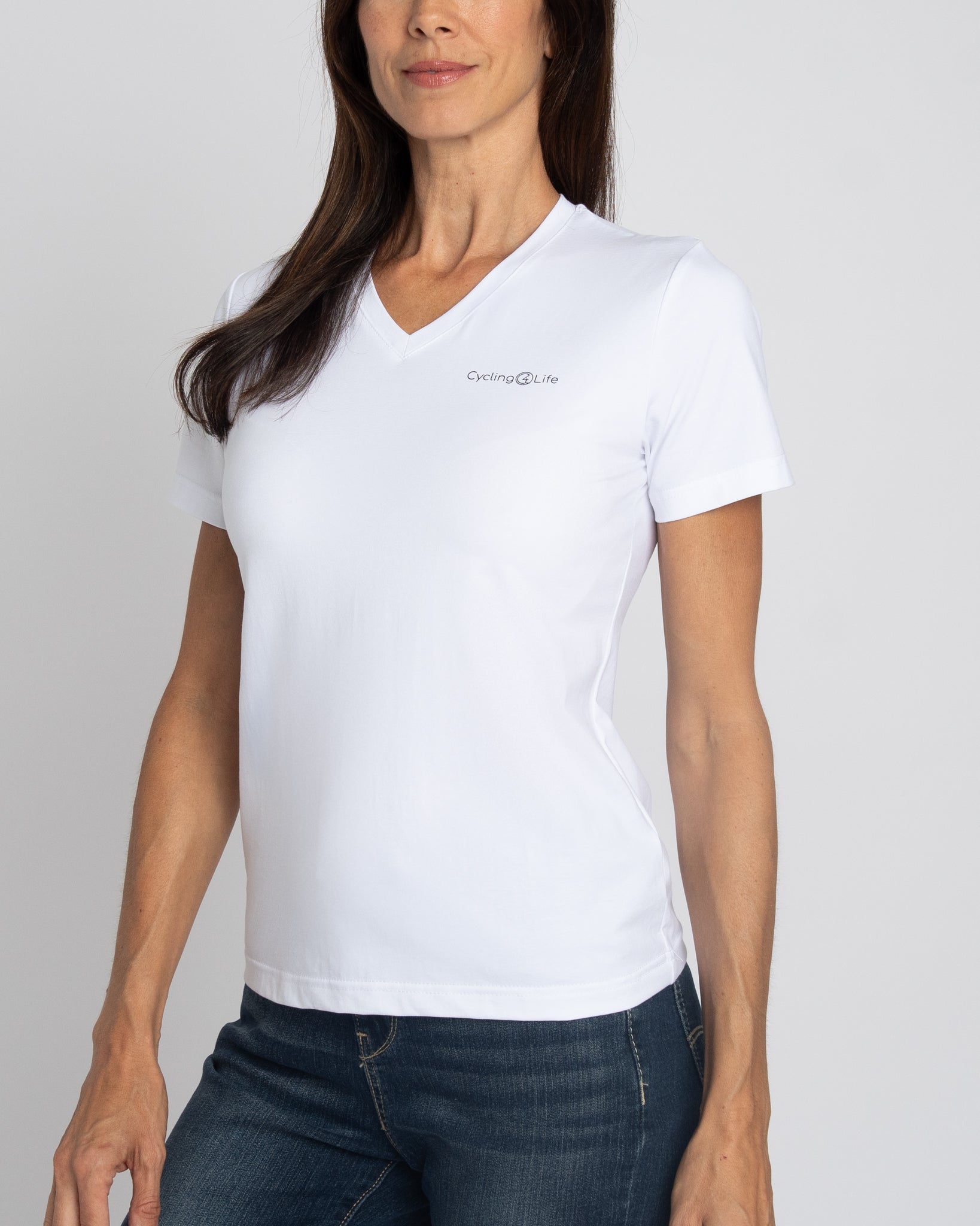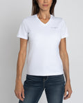 This women's V-Neck T-Shirt in white combines soft cotton with a touch of spandex, delivering exceptional comfort and flexibility. Its breathable fabric ensures all-day wearability, while the subtle stretch offers a flattering fit that moves with you. Ideal for layering or wearing alone, this versatile tee is a reliable staple for any wardrobe.